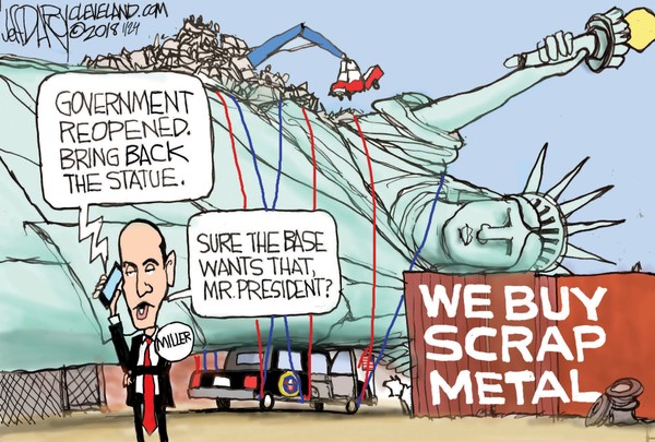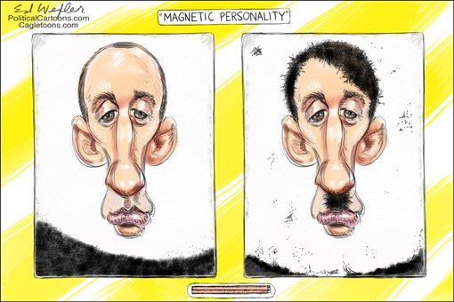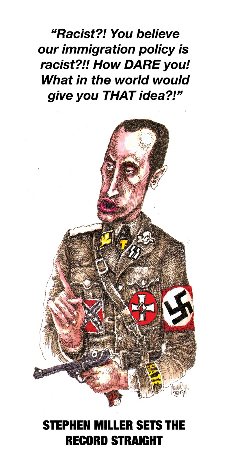 Jewish watchdog is horrified their tribal kin Stephen Miller, the balding 31-year-old extremist and senior advisor to the president is being caricatured as having a hooked-nose, oversized ears and fleshy lips.