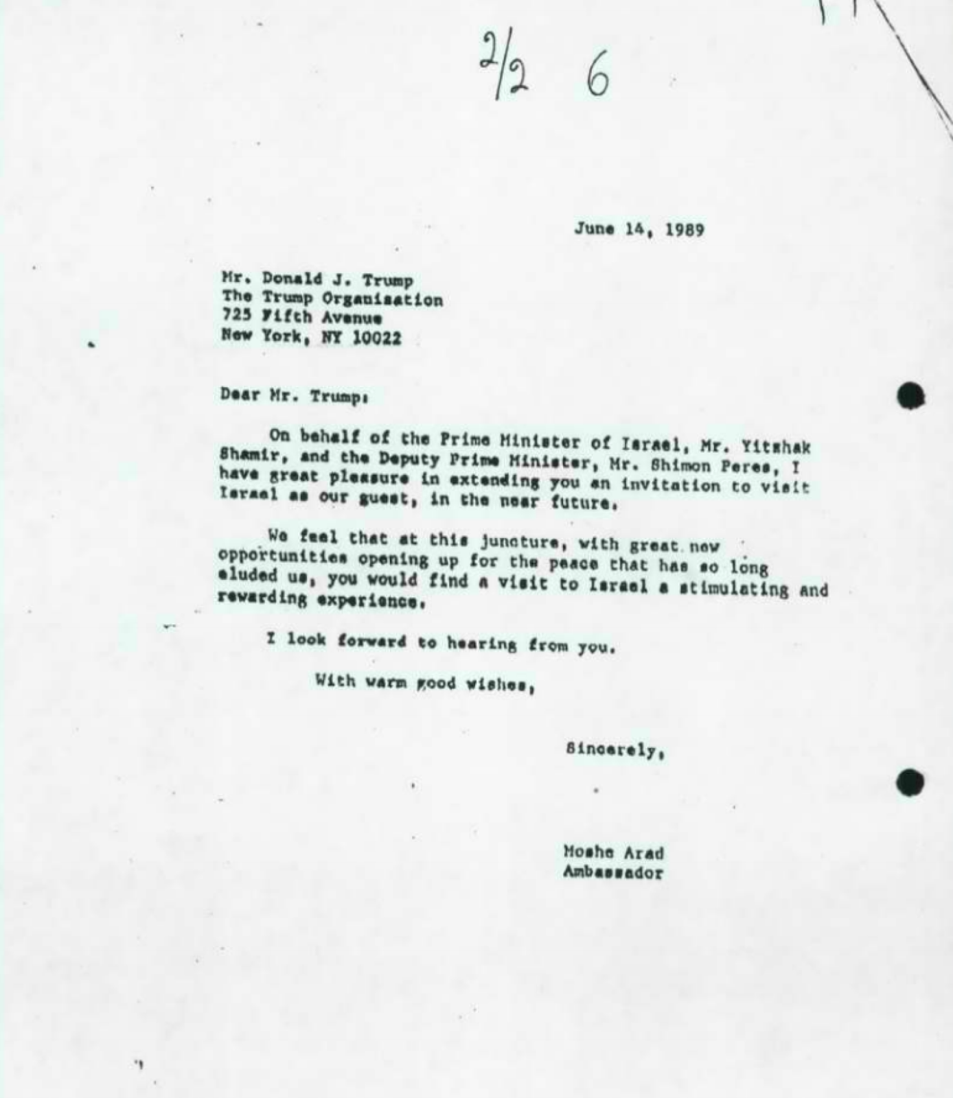 The invitation was signed by Israel’s then-ambassador to the U.S., Moshe Arad, in the name of the prime minister and his substitute.